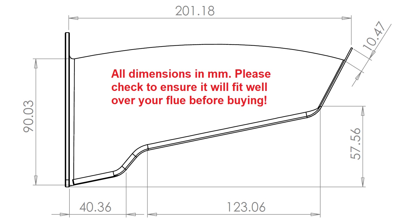 The various aspects and dimensions of the flue are shown below. Just be sure to check the length of your flue before purchasing this cover to ensure it will fit over the flue and the flue outlet will not protrude beyond the front lip of the cover, as that would defeat the object.